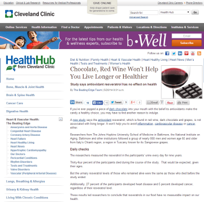 気になる記事「 Chocolate, Red Wine Won’t Help You Live Longer or Healthier」を見つけたので、メモ。チョコレートや赤ワインに含まれる、レスベラトロールという抗酸化物質は、健康には影響がないという研究報告です。